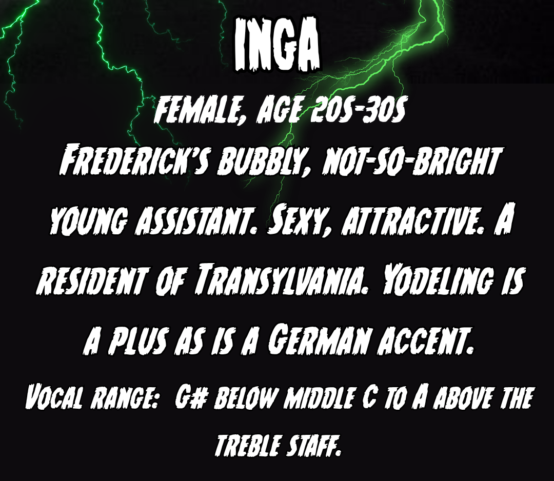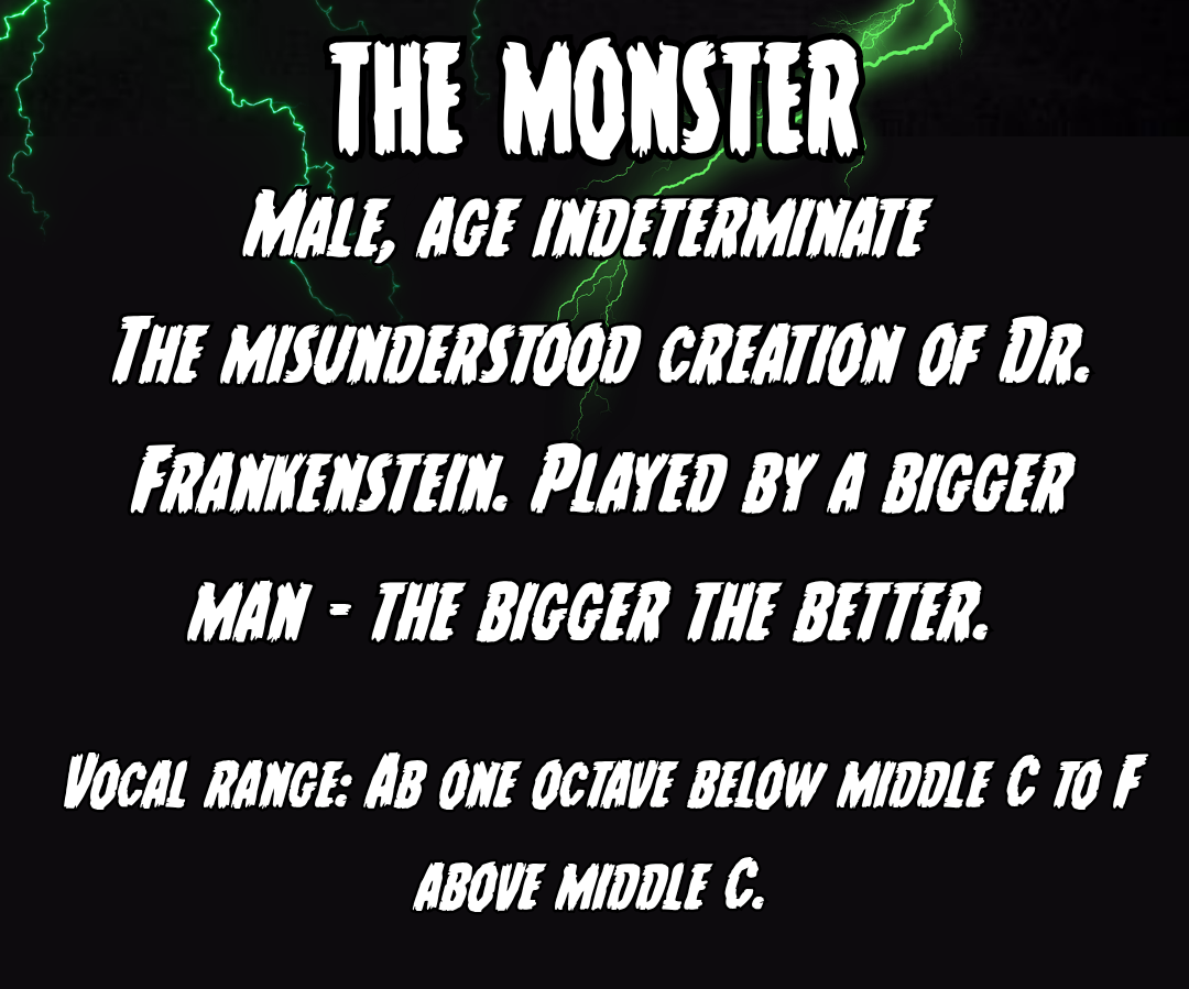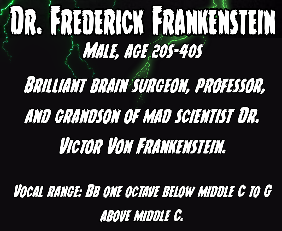 For auditions, prepare a musical selection in the style of the show—it does not need to be from Young Frankenstein. A song excerpt is perfectly fine, but please memorize it so you can really show off your character. Bring sheet music with clearly marked starting and ending cuts for the pianist.